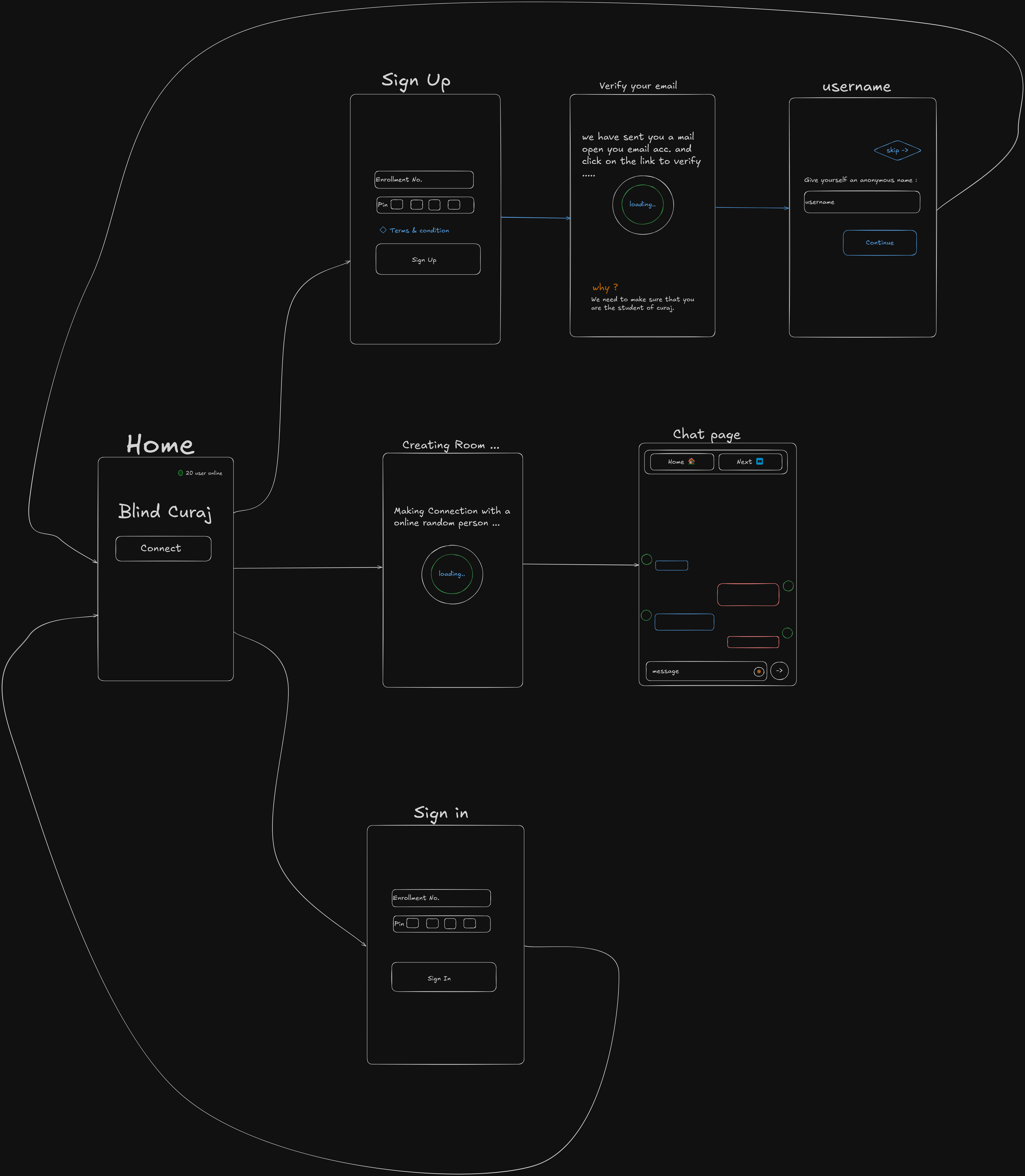 Blind Chat is a platform designed for students of a specific college to connect and interact with their peers using their official college email IDs. The platform enables real-time communication via WebSocket and a modern frontend built with Next.js. The project is open-source, and you can easily adapt it for your own college by modifying the configuration file.